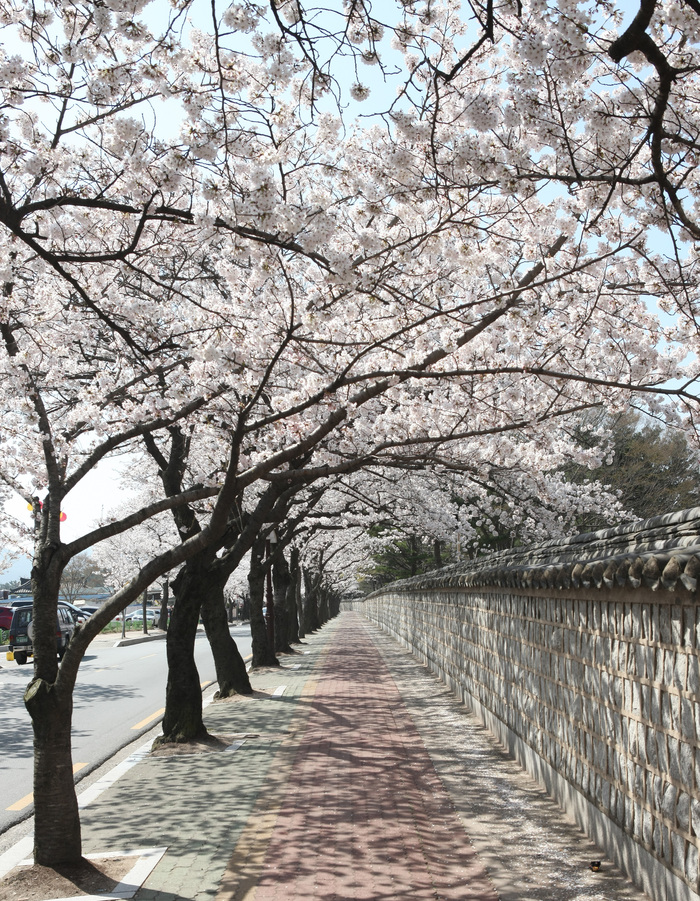 신라 고분과 벚꽃이 어우러진 대릉원은 경주에서만 볼 수 있는 특별한 풍경을 자랑합니다. 돌담을 따라 피어난 벚꽃은 고즈넉한 분위기를 자아내며, 특히 석양 무렵의 풍경이 일품입니다.